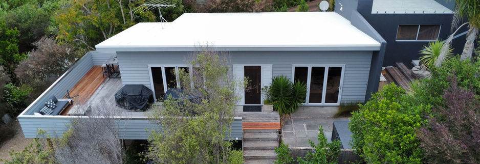 This was an exciting project being one of the original seafarers villas situated in the prestigious gated community of Arran Bay, Waiheke Island. The Scope of works was to revive the clients beautiful, historic beach villa to all its glory, giving it a full exterior Re-Clad, replaced all external flashings and joinery facings, new back deck framing and decking along with remedial/structural works required to future proof this iconic property.